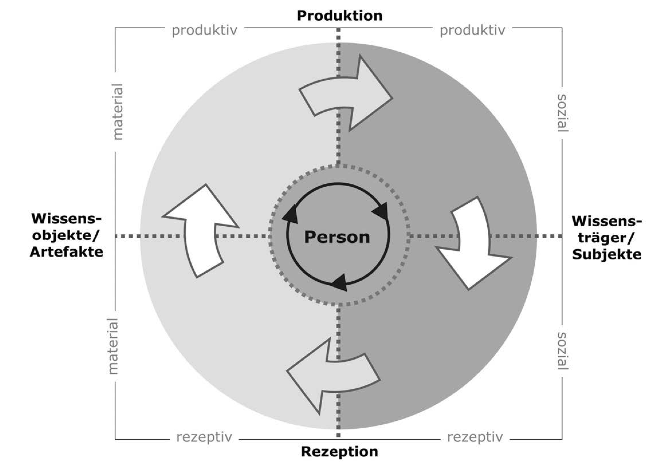 Das Modell zum persönlichen Wissensmanagement (Reinmann & Eppler, 2008) strukturiert den Umgang mit Wissen anhand mehrerer grundlegender Unterscheidungen. Zentral ist zunächst die Trennung zwischen persönlichem, innerem Wissen und der äußeren Wissensumwelt. Letztere umfasst sowohl Personen als Wissensträger als auch materielle Wissensobjekte wie Texte oder Medien. Der Austausch mit dieser Umwelt kann rezeptiv (aufnehmen und verstehen) oder produktiv (gestalten und erzeugen) erfolgen.