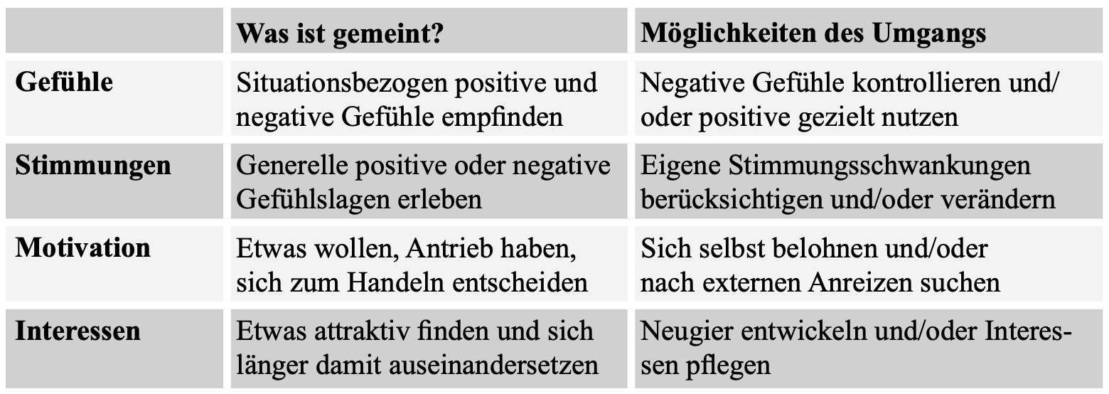 Gefühle, Stimmungen, Motivation und Interessen beeinflussen kognitive und metakognitive Prozesse maßgeblich, da sie bestimmen, wie wir Wissen aufnehmen, verarbeiten und anwenden. Insbesondere Stress verengt das Denken, verschlechtert das Lernen, die Kreativität und das Problemlösen. Dabei ist zwischen akuten Emotionen und länger anhaltenden Stimmungen sowie zwischen situativer Motivation und stabilen Interessen zu unterscheiden. Obwohl sich diese Faktoren kaum planen oder steuern lassen, sollten sie als grundlegende Prinzipien im persönlichen Wissensmanagement berücksichtigt werden.
